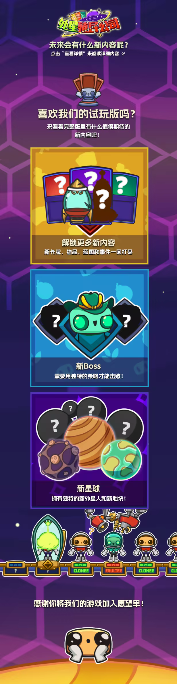 带领你的员工,探索并占领一颗颗未知的星球吧!在回合制对决中,组建强大的牌组,灵活部署你的员工,使用公司新研发的究极武器,智胜外星人,掠夺珍贵宇宙资源。不断扩张成为外星殖民公司的年度最佳团队!
