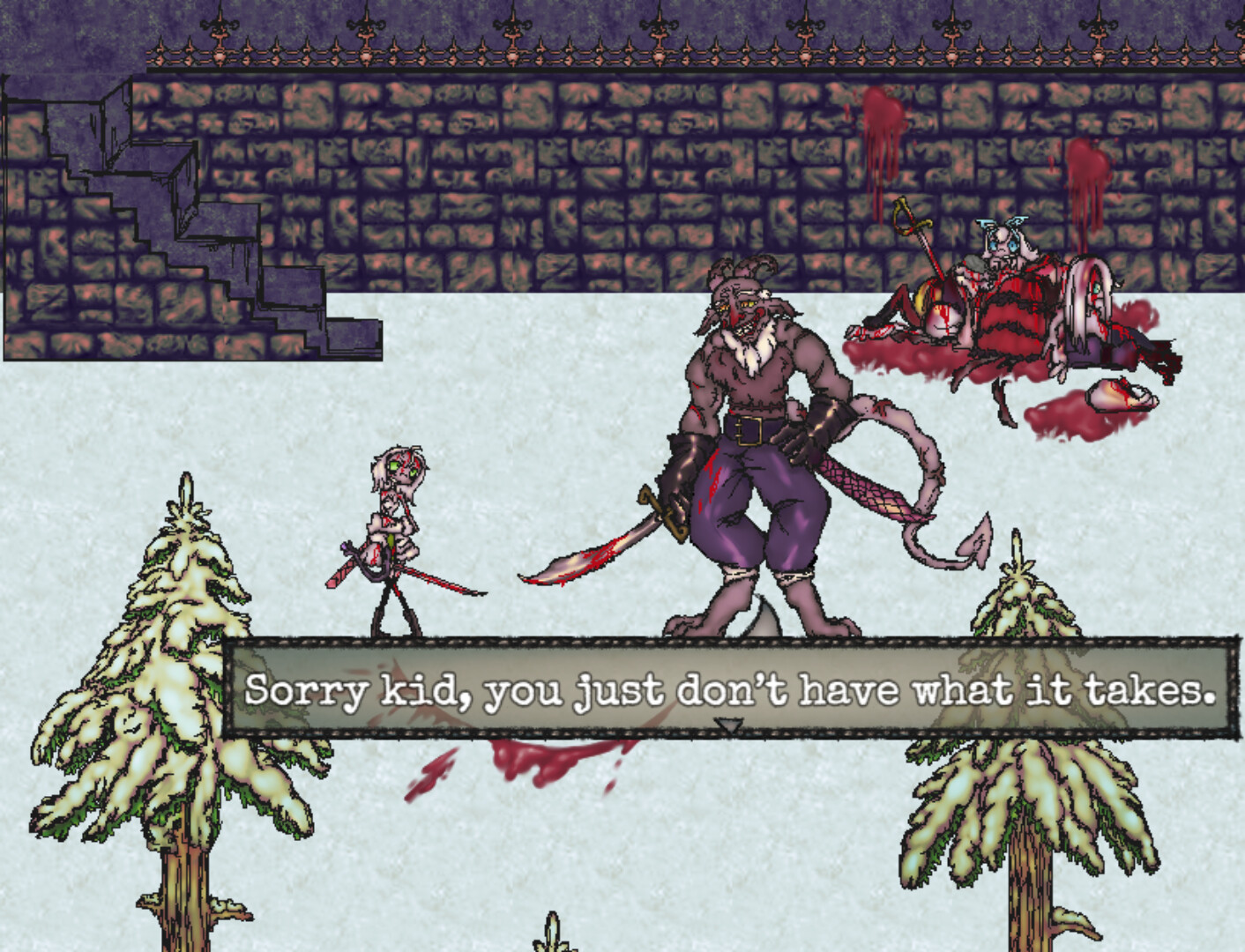 In this game, you play as a tomboy maid, runaway from her captor and master, who dreams of exploring the world, becoming a famous warrior princess and finding many riches - but the evil nature that runs in your devilry blood, the razor-sharp teeth and striking white hair, make you an enemy of many and a friend to few.
