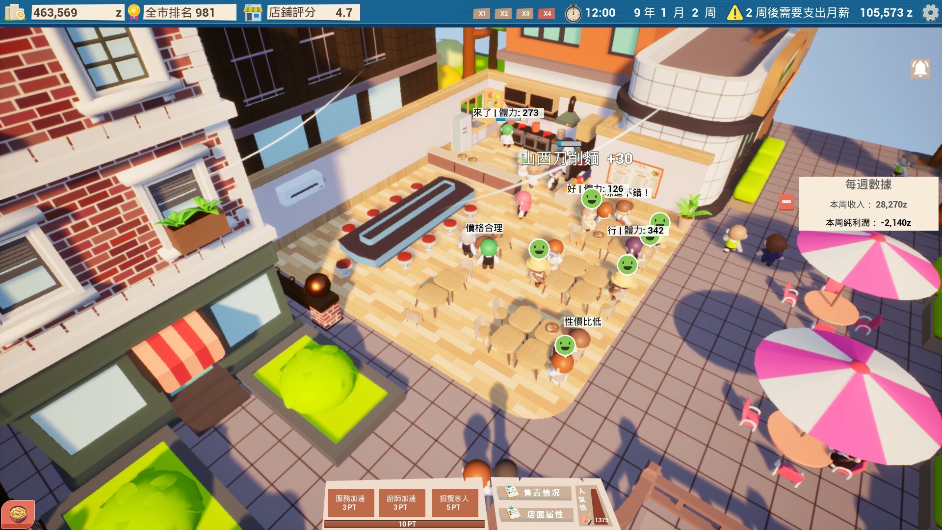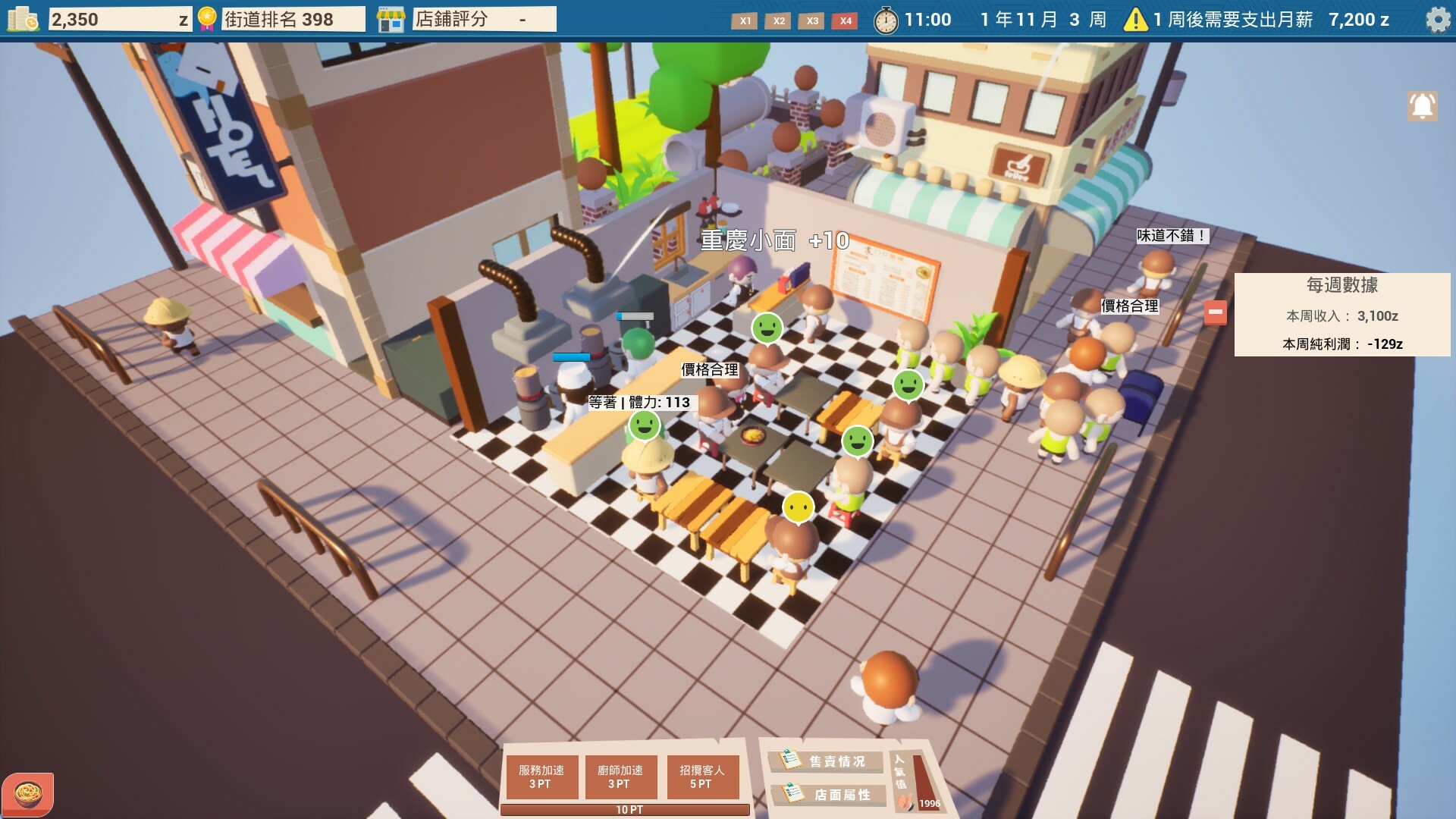 在遊戲發展中,你需要考慮麵館的經濟情况、工作人員數量、顧客喜好度等因素,根據實際情況定制策略,只有執行正確策略的情况下,才能將麵館經營的更好,否則就會虧本,甚至破產