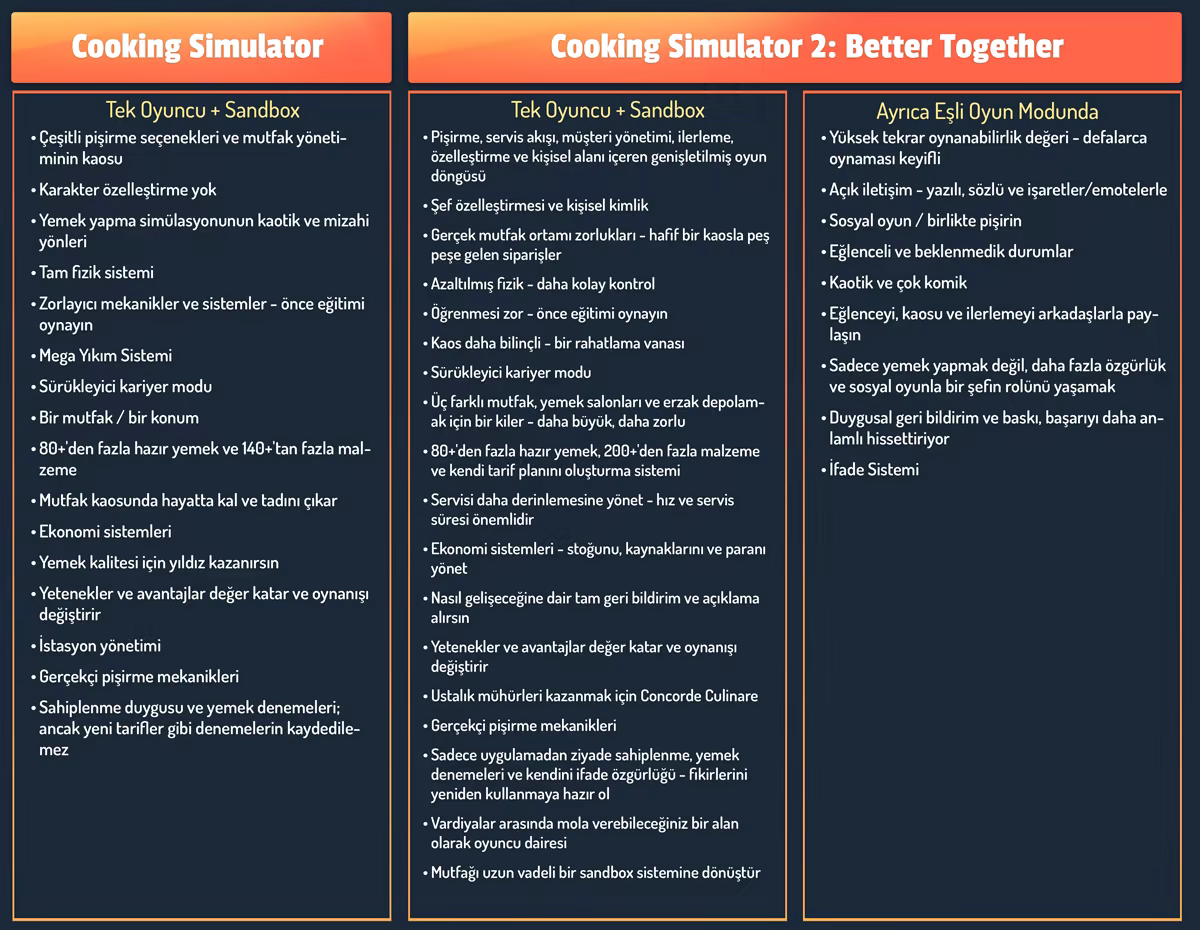 Yardıma ihtiyacınız olduğunu mu düşünüyorsunuz? Bir arkadaşınızı çağırın. Çok oyunculu iş birliği modu, arkadaşlarınızın kendi gereçleri ve yemek konusundaki bilgileriyle doğrudan mutfağınıza girmelerini sağlar. İş yükünü paylaşın, kazancı bölüşün ya da rahatlamak ve eğlenmek için sandbox moduna geçin. İstediğinizi pişirin, saçma sapan deneyler yapın, tarifleri test edin ya da efsanevi bir yiyecek kavgası başlatın. Bu kendi mutfağınız, kendi kaosunuz.
