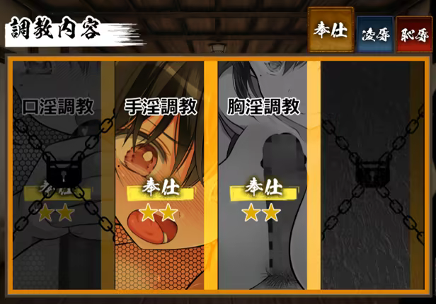You can train Ayame in three different ways: by letting her pleasure you, by violating her, or by disgracing her.
