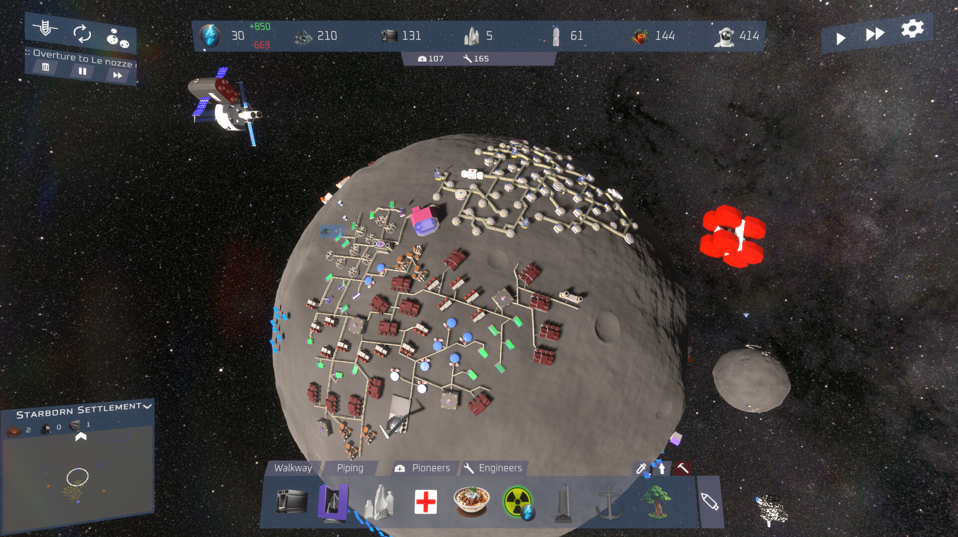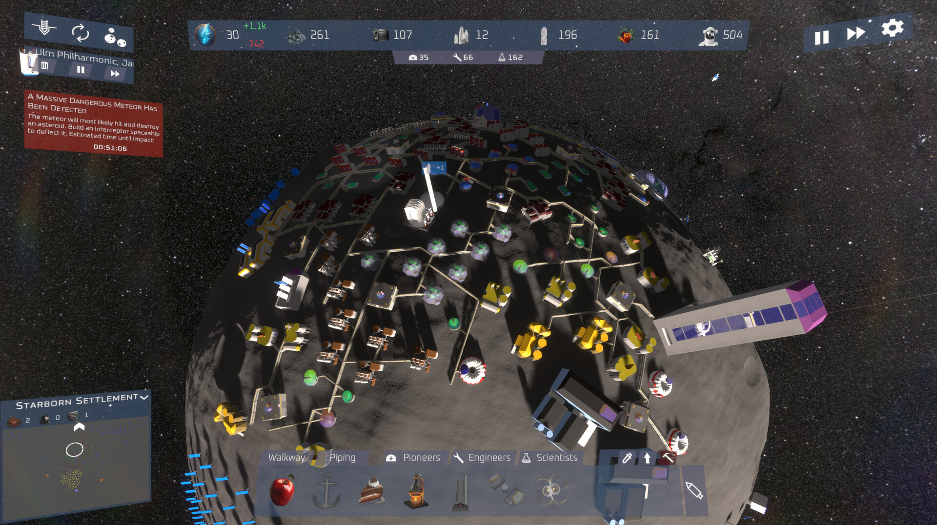 Space is a resource-poor and dangerous place, with many meteors and comets on collision course with your settlement. If you don’t want your settlement to end in a giant fireball, you will need to find technologies to keep your residents alive and well. Build telescopes to find and track dangerous space rocks, and launch specialized rockets to deflect their trajectory enough to hopefully prevent them from colliding with your colony.