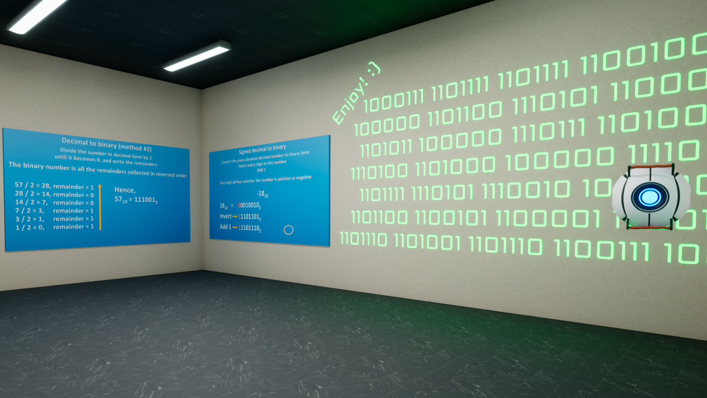 The system is set in a 3D space where users move from one room to another. An AI robot assistant named “Vector” provides users with various information depending on where they are in the system. In addition to the modules, there is also a separate quest where users receive tasks in different sections. At each level of the quest, the complexity of tasks increases randomly.