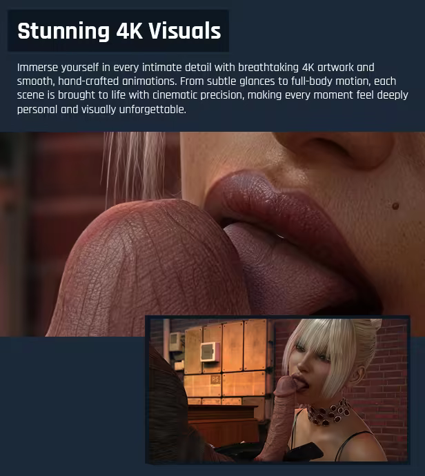 Our game depicts consensual sexual activities among adults, including male-female, female-female, and multi-partner scenarios. It explores themes such as partner sharing, wife swapping, infidelity, sex toys, role-playing, and other erotic practices. All acts, though considered kinky, are portrayed respectfully and described tastefully.