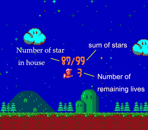 Pause check the remaining number of stars and lives; in the process of one level, press Start button (Note: it will work after the words on the screen disappear for a while).