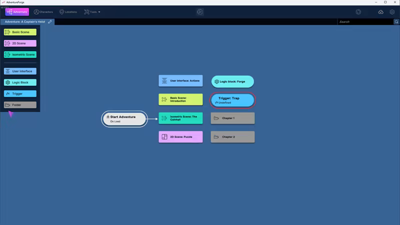 The core of Adventure Forge is the Adventure Flow which visually illustrates the flow of your game. Adventures are constructed from Scenes and within scenes are Events, this tiered system enables designers to layer different types of interactions such as having conversations appear over a visual novel or a lockpick mini-game over an isometric RPG. This nested approach allows every Scene and Event to contain its own logic thus avoiding the problem of a giant tangled web of branches and logic.