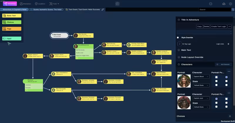 Creating branching conversations and game logic is simple, fast, and all that’s needed for most games, but branching does have limits for interactivity and scalability. Adventure Forge provides an additional more powerful and flexible way to connect conversation nodes, scenes, events, and logic blocks which we call Weighted Navigation.