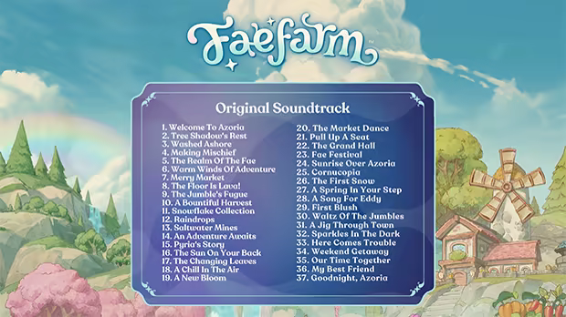 Revivez votre aventure à Azoria grâce à la bande originale de Fae Farm ! La bande originale officielle de Fae Farm inclut 37 morceaux originaux tirés du jeu. Découvrez plus d'une heure de thèmes orchestraux composés par Cris Velasco pour votre voyage épique à travers le monde magique et animé d'Azoria, une île remplie de biomes merveilleux, de personnages attachants et de créatures fantastiques.