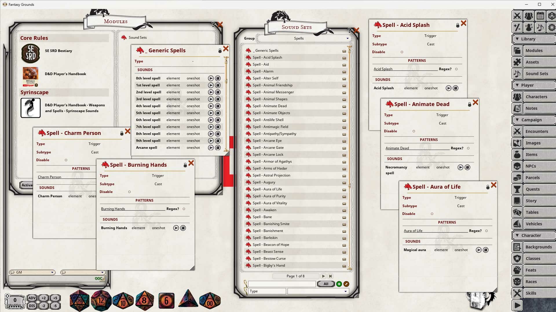 Syrinscape Sound Link Packs for Fantasy Grounds work with your Syrinscape Super Syrin subscription to provide you context-specific sounds for weapon attacks, casting of spells, and damage types for content in the D&D Player's Handbook.  The collection of Sound Sets can be created for free within the Fantasy Grounds Unity sound interface, but this pack has done all the work for you to link the content. Appropriate sounds from Syrinscape will trigger automatically based on attacks (hit, miss, critical success, critical failure), damage dealt, or the spell being cast.