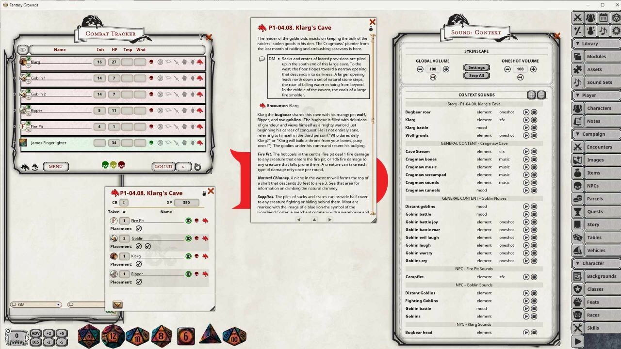 subscription to provide you context-specific sounds for monsters and NPCs in the D&D Monster Manual.  The collection of Sound Sets can be created for free within the Fantasy Grounds Unity sound interface, but this pack has done all the work for you to link the monsters and story elements as you play the adventure. Appropriate sounds from Syrinscape will show up in your Sound Context Window automatically when you access a story element or reference manual page, or when you add an encounter to the combat tracker.