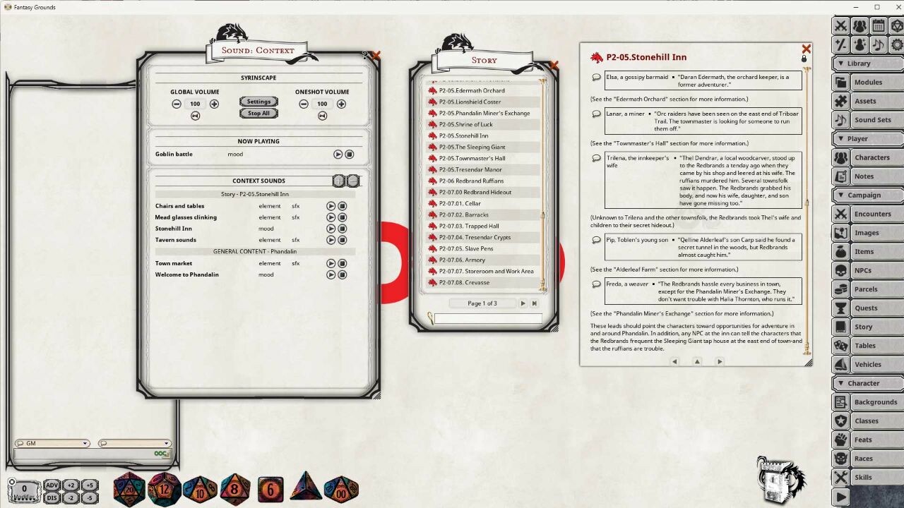 subscription to provide you context-specific sounds for monsters and NPCs in the D&D Monster Manual.  The collection of Sound Sets can be created for free within the Fantasy Grounds Unity sound interface, but this pack has done all the work for you to link the monsters and story elements as you play the adventure. Appropriate sounds from Syrinscape will show up in your Sound Context Window automatically when you access a story element or reference manual page, or when you add an encounter to the combat tracker.