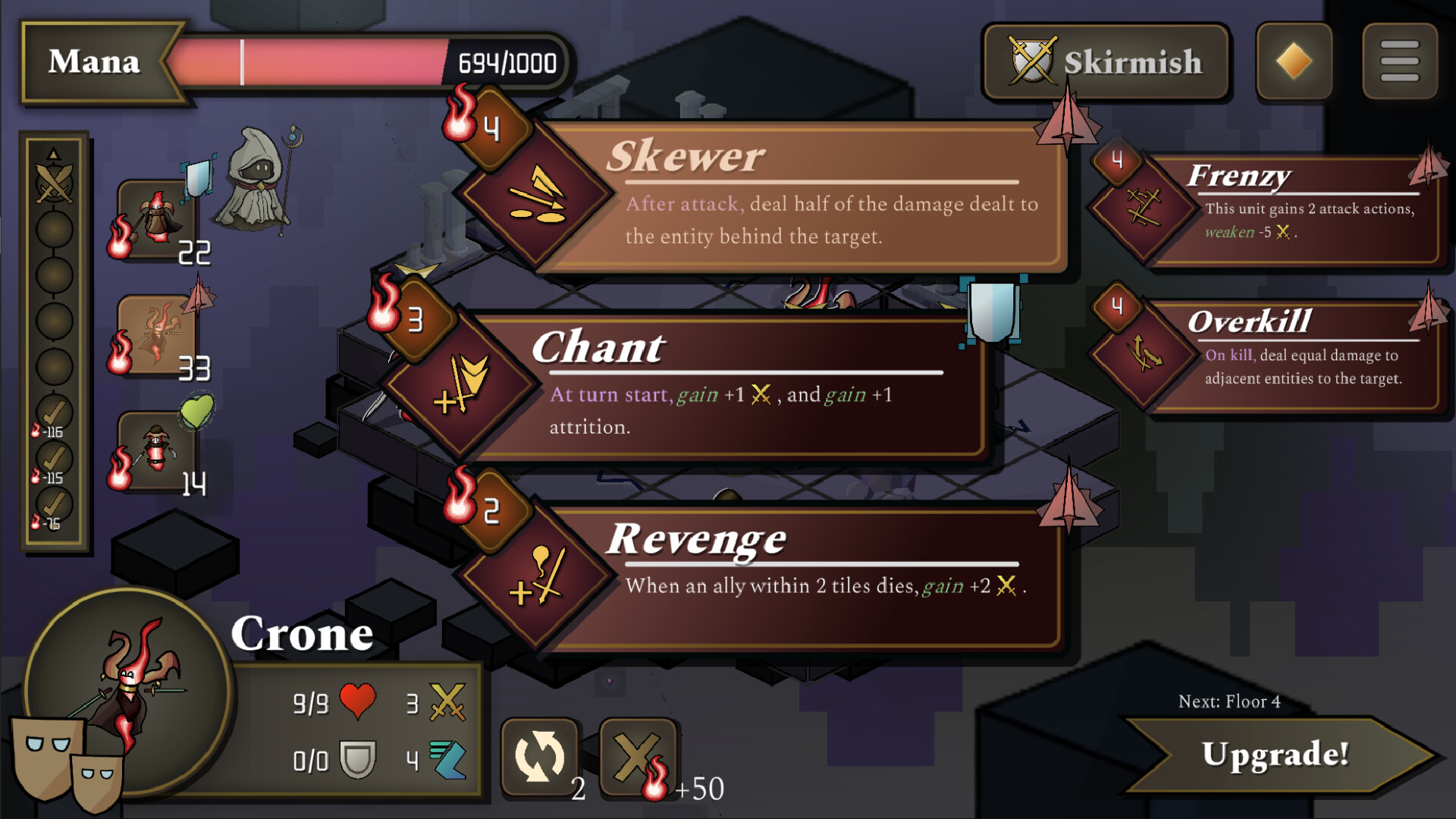 Gain upgrades from defeating each wave of enemies. Each upgrade increases the mana cost of your units. So balance your needs accordingly. With hundreds of upgrades to pick from, discover cool synergies and turn your units into powerhouses!