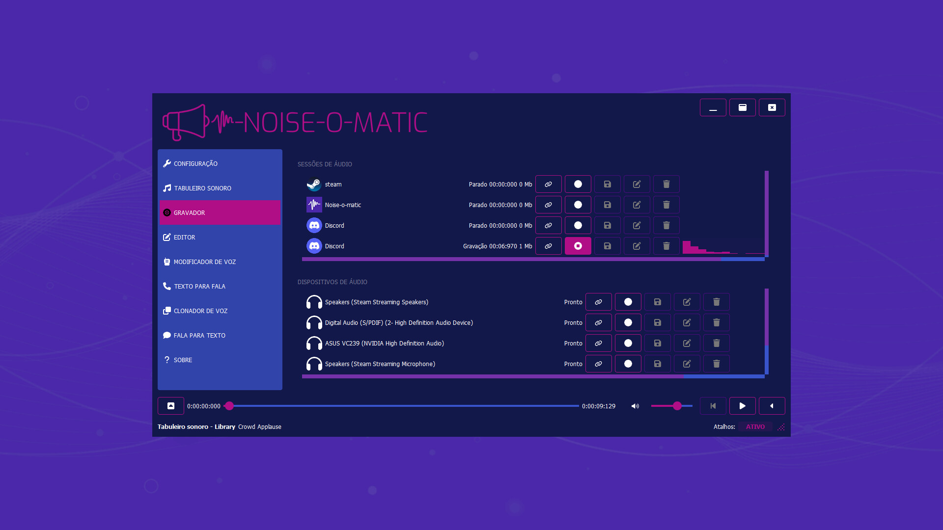 Com o Noise-o-matic, você pode facilmente adicionar qualquer música ou som a qualquer bate-papo por voz, não importa se você está no Discord, Skype ou jogando. Ele se conecta ao fluxo do seu microfone, dando a você o poder de personalizar suas conversas com efeitos de áudio incríveis. Vamos fazer barulho!