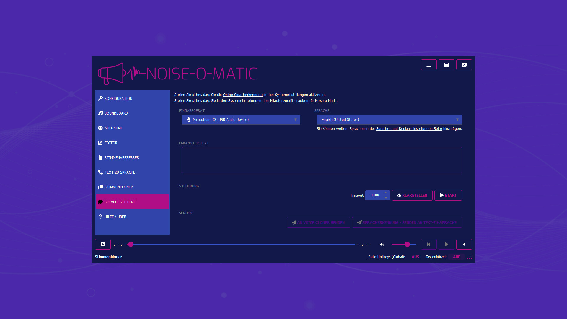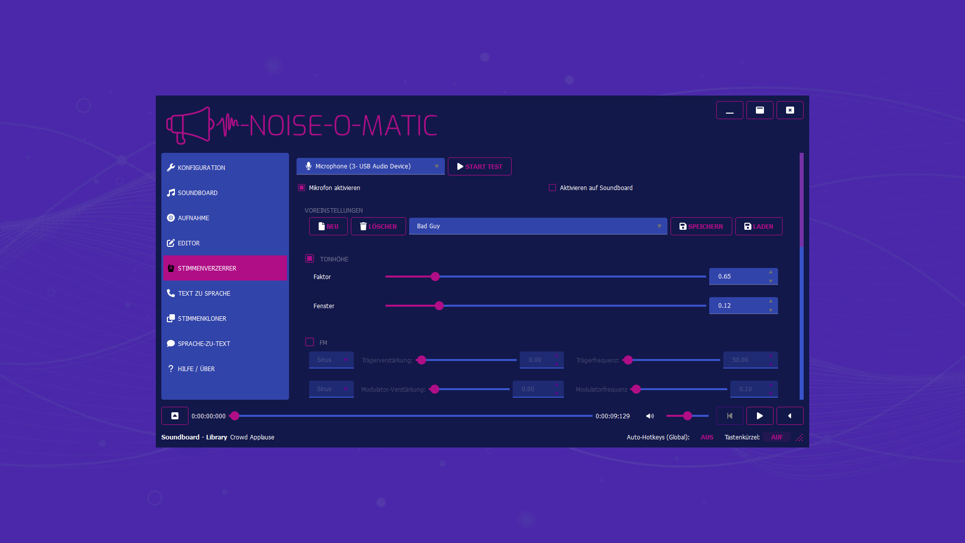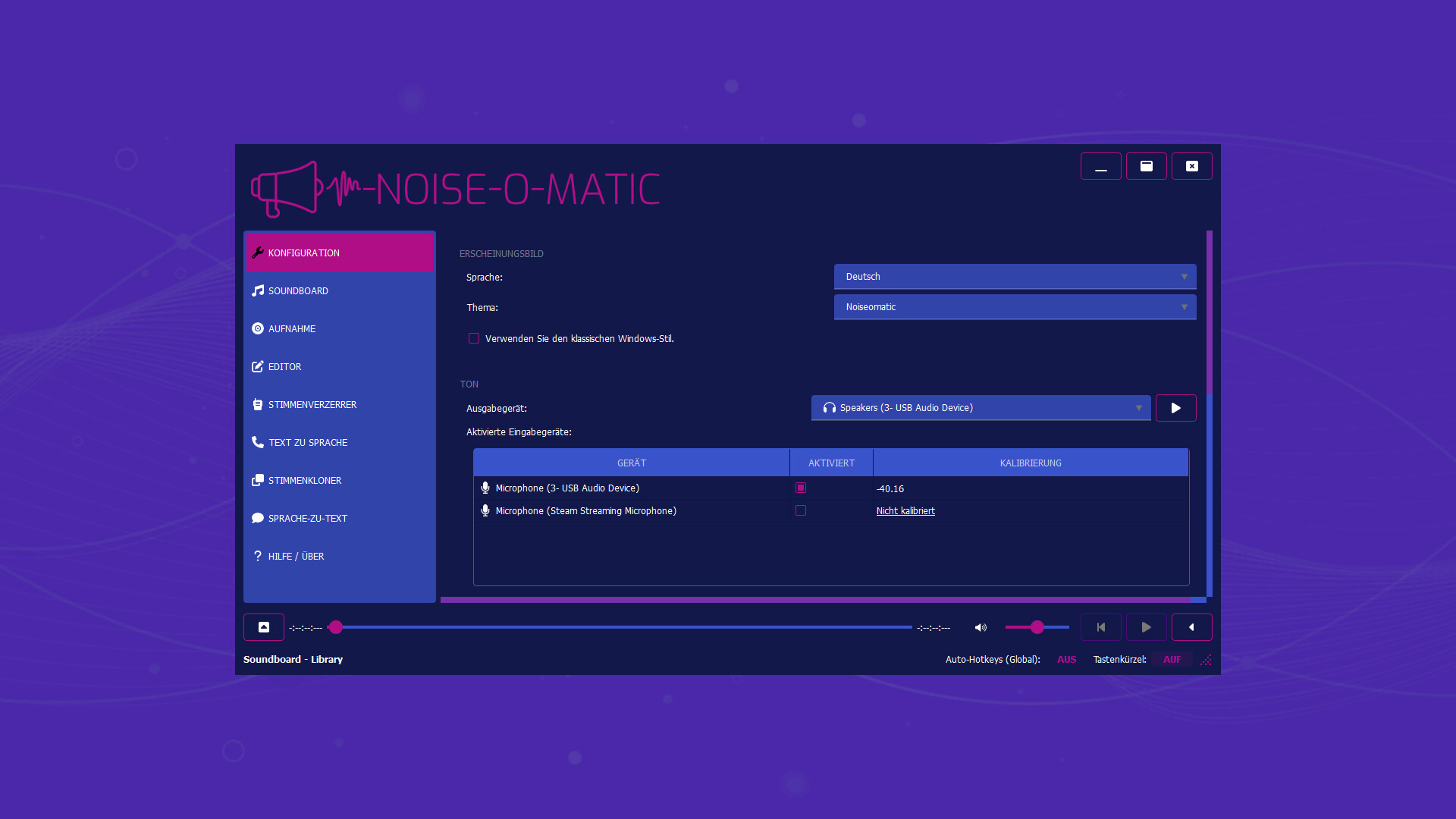 Bitte beachten Sie, dass ein Mikrofon erforderlich ist, um Noise-o-matic zu verwenden, sowie ein Ausgabegerät.