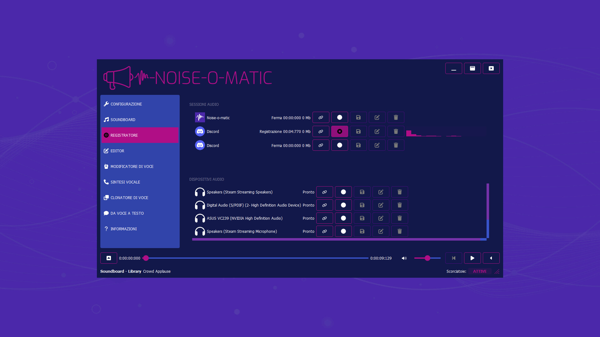 Software di soundboard per chat vocali: riproduci suoni, registra e modifica la tua voce in tempo reale in qualsiasi applicazione o gioco! Aggiungi musica e suoni al tuo microfono in un click. Funzione di sintesi vocale inclusa. Steam Workshop supportato nativamente! Facciamo rumore!