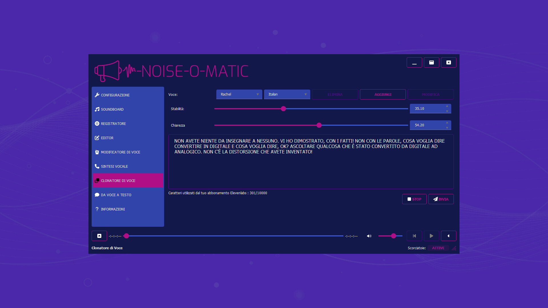 This application allows usage of elevenlab's text to speech feature. Shall the user choose to use this feature, they should create an account over elevenlabs.com and import their API key. It's entirely optional and subject to both Noise-o-matic's EULA as well as elevenlab's EULA.