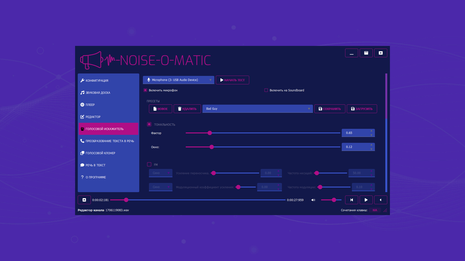 Изменяйте тон своего голоса и применяйте множество других фильтров в реальном времени для изменения вывода вашего микрофона! Используйте один из предустановленных в Noise-o-matic или раскройте свою креативность!