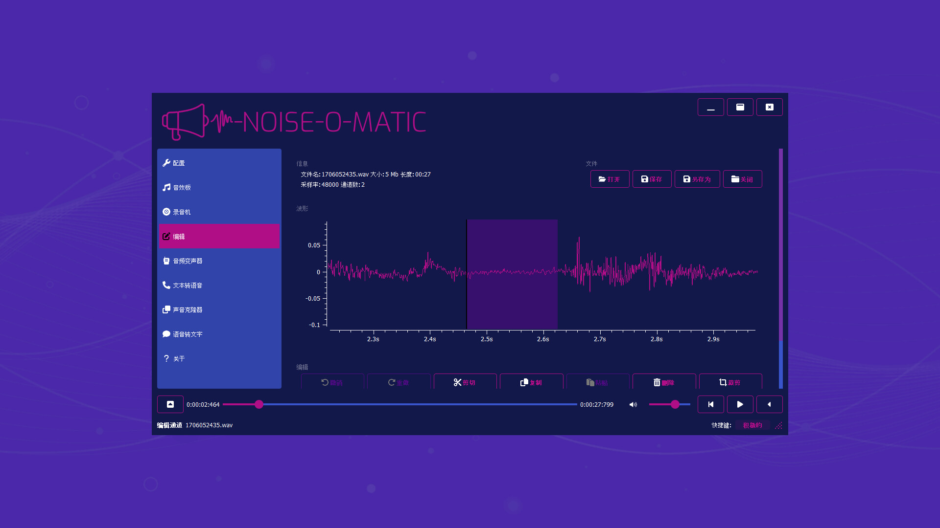 Noise-o-matic支持许多现代格式,包括mp3、wav、wma、ogg、flac。