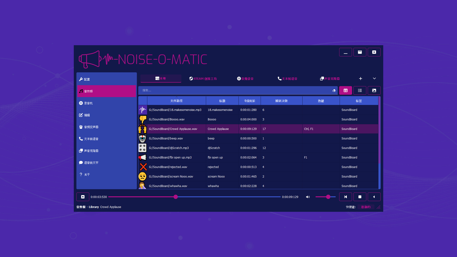 高质量的声音板软件,适用于语音聊天:在任何应用程序或游戏中播放声音,实时录制和修改您的声音!将音乐和声音添加到您的麦克风,供其他人听到。包含文本到语音功能。原生支持Steam Workshop!一起制造一些噪音!