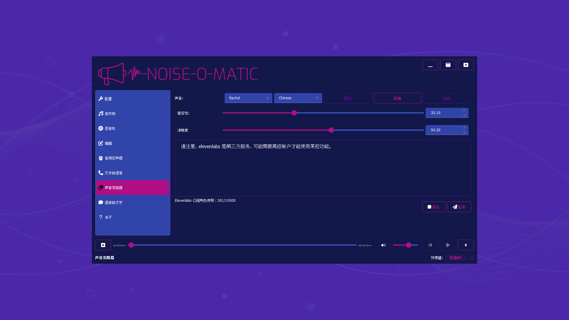 This application allows usage of elevenlab's text to speech feature. Shall the user choose to use this feature, they should create an account over elevenlabs.com and import their API key. It's entirely optional and subject to both Noise-o-matic's EULA as well as elevenlab's EULA.