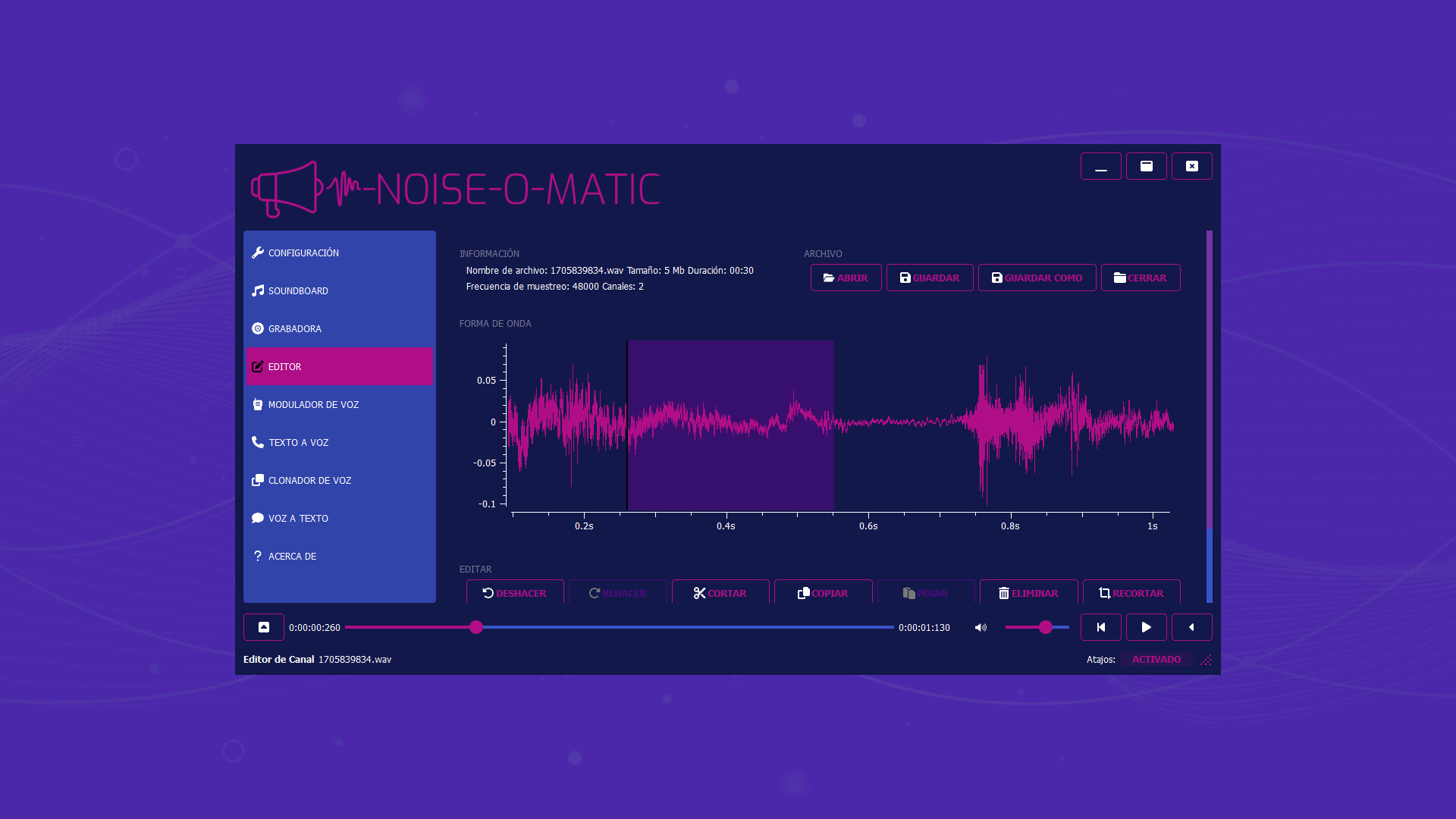 Noise-o-matic admite muchos formatos modernos, incluyendo mp3, wav, wma, flac, ogg.