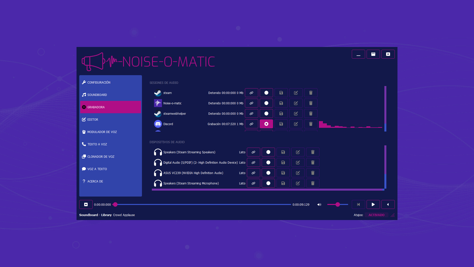 ¡Software soundboard de alta calidad para chats de voz: reproduce sonidos, graba y altera tu voz en tiempo real en cualquier aplicación o juego! ¡Agrega música y sonidos a tu micrófono para que otros los escuchen! ¡TTS incluida! ¡Steam Workshop soportado de forma nativa! ¡Hagamos algo de ruido!
