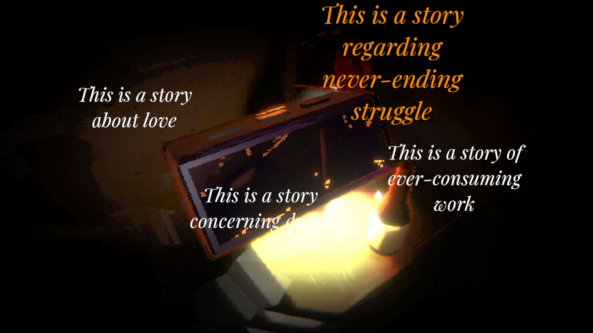 Tonight, I Die in My Sleep is an experimental, surreal first-person exploration of dreams and identity. Take the role of an actor participating in a one-man act, stumbling through scenes blending waking nightmares with deteriorating memories. Explore the relationship between art and its creator, between agency and powerlessness. Find meaning in your playthrough.