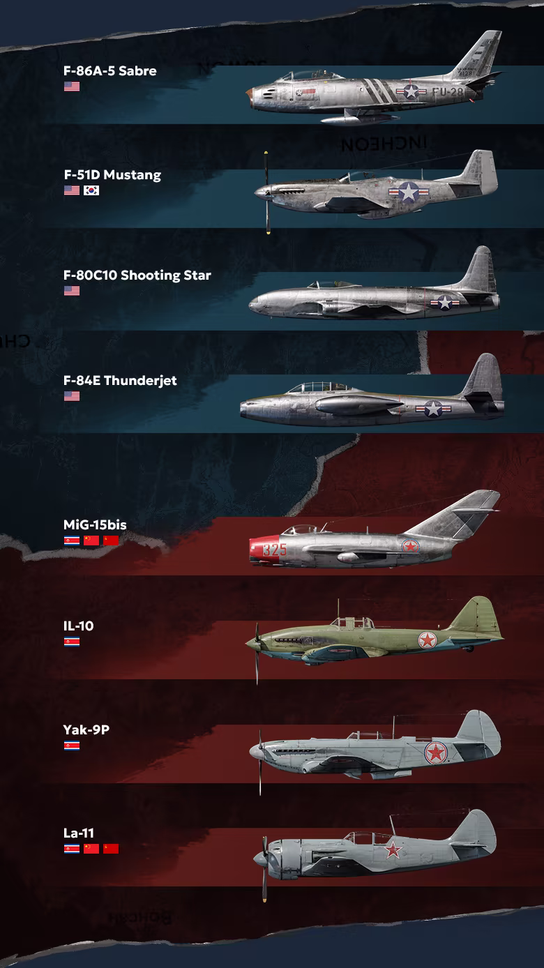 The aircraft of the Korean War have been recreated based on actual blueprints, historical photographs, flight manuals, and other archival materials. There are eight aircraft at your disposal.