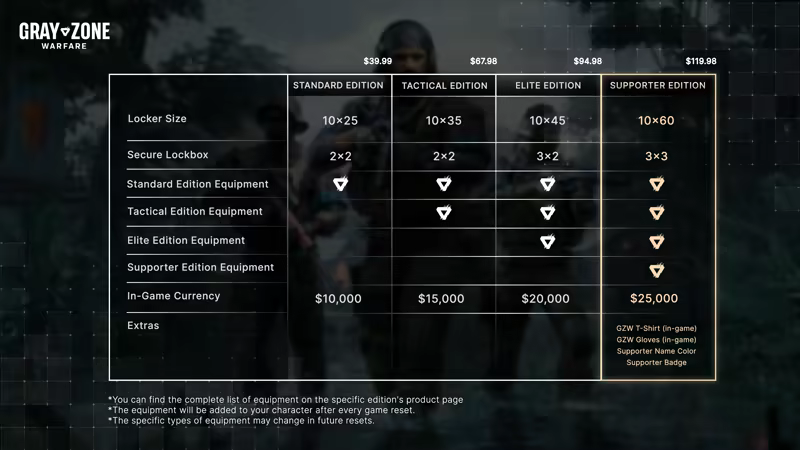 Includes 3 items: Gray Zone Warfare - Tactical Edition Upgrade, Gray Zone Warfare - Elite Edition, Gray Zone Warfare - Supporter Edition