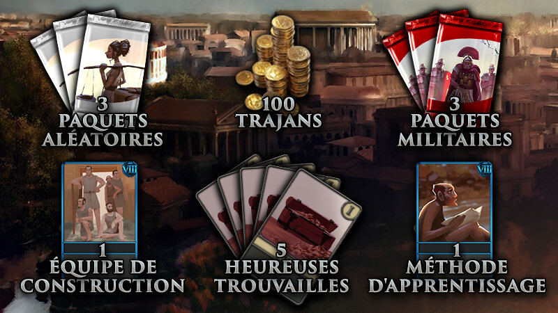 Le Pack de débutant Steam est parfait pour les nouveaux joueurs qui cherchent à initier la domination de Rome dans Romans: Age of Caesar. Que vous souhaitiez cultiver paisiblement, vous engager dans des fourberies politiques ou vous venger de vos ennemis jurés, ce pack de débutant vous permettra de prendre une longueur d'avance décisive dans votre quête des lauriers. Profitez de 100 Trajans, de 3 paquets de cartes aléatoires et de 3 paquets de cartes militaires, ainsi que de 7 cartes bonus pour doper l'apprentissage et d'autres domaines essentiels du jeu :