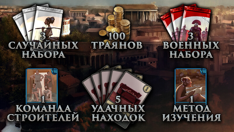 Стартовый набор Steam для новых игроков, которые хотят быстрее добиться успеха в Romans: Age of Caesar. Он даст вам фору в гонке за корону, чем бы вы ни хотели заниматься: хозяйством, политикой или войной. В набор входят 100 траянов, 3 набора случайных карт и 3 набора военных карт, а также 7 бонусных карт для ускорения изучения и помощи в других аспектах игры: