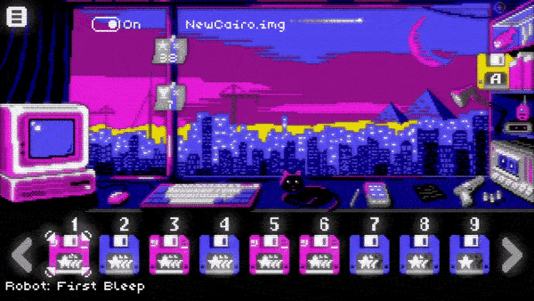 • The investigator examines the floppy disks one by one, trying to unravel the mystery of the missing asteroid. Each floppy is one level of the game.