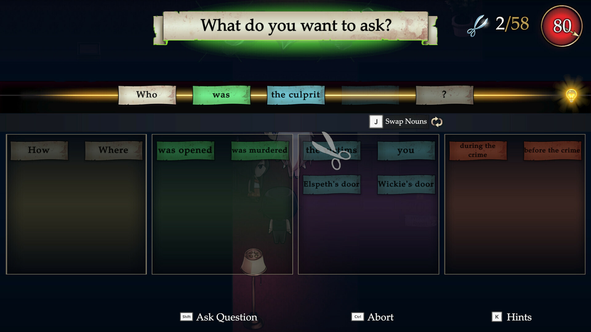 • Find clues in the form of paper words and form your own sentences to interrogate suspects