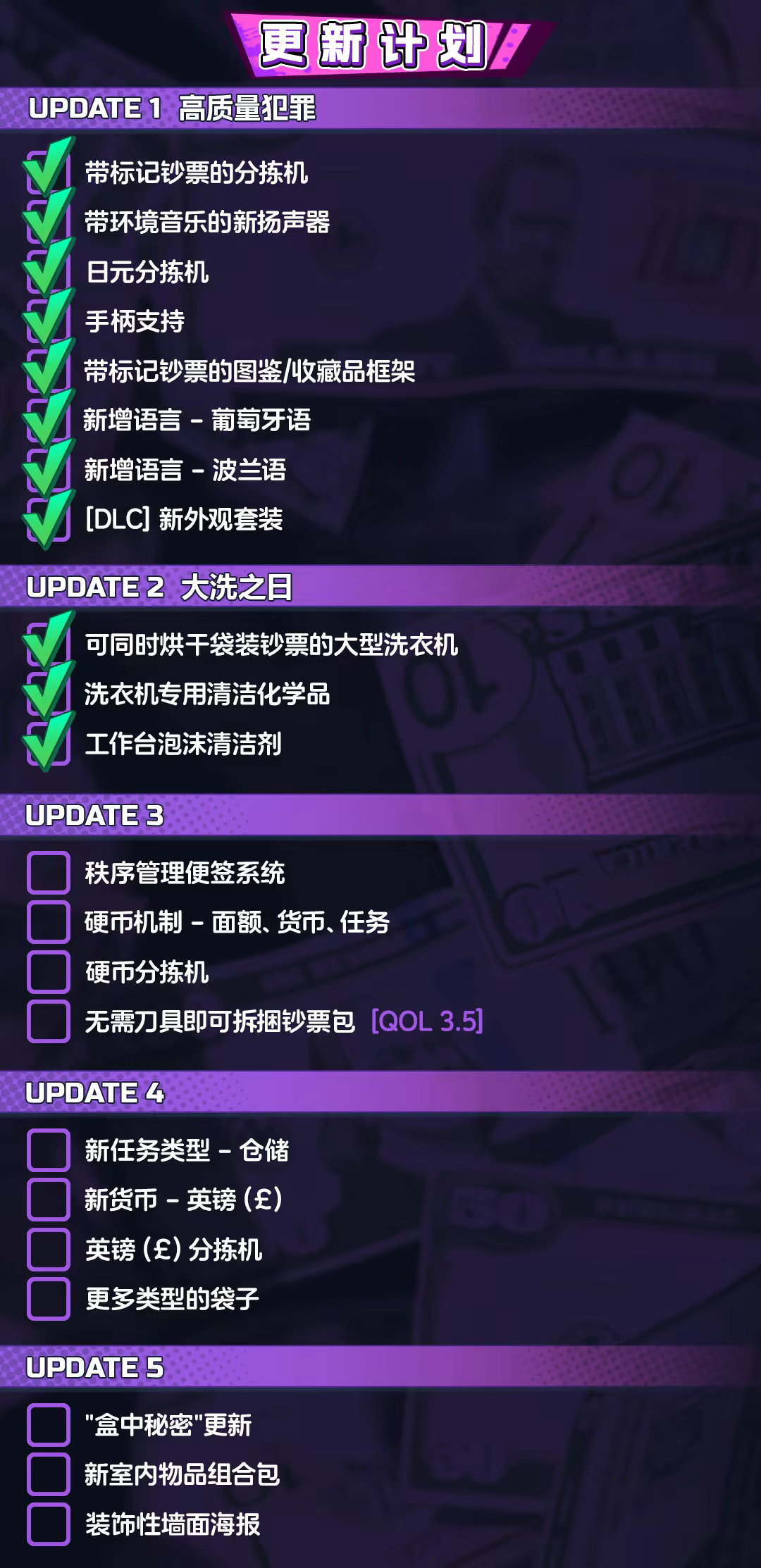 使用洗衣机、烘干机、点钞机和其他工具来清洗脏钱和区分假钞等工作。当然,看见沾上各种奇怪污垢或神秘“番茄酱”的钞子不要瞎猜,遵循祖训,老老实实干活赚钱就行了!同时,你也可以通过财富积累去置办新的设备,从而拓展业务规模,做大做强!