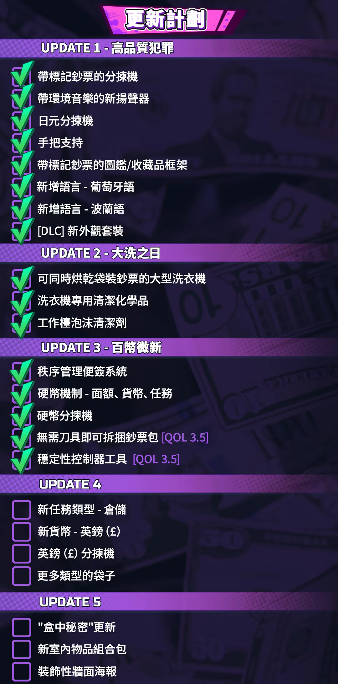 使用洗衣機、烘乾機、點鈔機和其他工具來清洗髒錢和區分假鈔等工作。當然,看見沾上各種奇怪汙垢或神秘“番茄醬”的鈔子不要瞎猜,遵循祖訓,老老實實幹活賺錢就行了!同時,你也可以通過財富積累去置辦新的設備,從而拓展業務規模,做大做強!