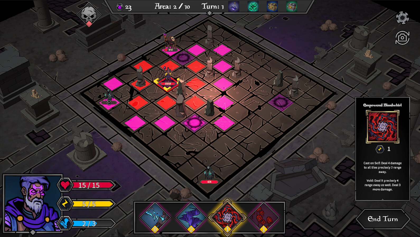 Each turn, you can move your character and spend energy on spells. You can have up to 4 spells equipped at a time, and each spell has its own hit pattern on the board. Once you cast your first spell you can no longer move that turn, so try to maneuvre to utilise your spells to the fullest!