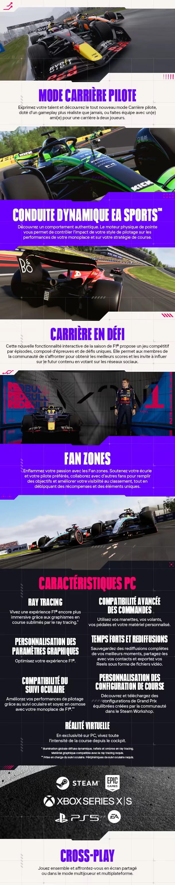 Faites partie des 20 avec EA SPORTS™ F1® 24, le jeu vidéo officiel du 2024 FIA Formula One World Championship™. Exprimez votre talent dans votre quête de gloire en Carrière F1®, la première mise à jour majeure du mode depuis 2016. Pilotez comme les légendes et soyez en osmose avec votre monoplace grâce au tout nouveau système de Comportement dynamique d’EA SPORTS. Enflammez votre passion en vous connectant à vos écuries et à vos pilotes favoris, tout en prouvant votre dextérité au volant via des expériences et des modes inédits.