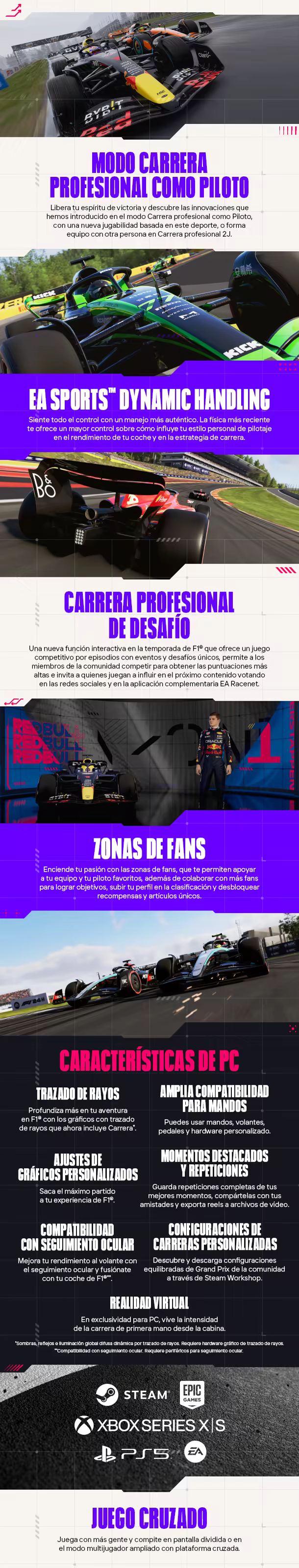 Forma parte de los 20 con EA SPORTS™ F1® 24, el videojuego oficial del 2024 FIA Formula One World Championship™. Libera tu espíritu de victoria para convertirte en leyenda en Carrera profesional de F1®, la primera gran actualización de este modo desde 2016. Conduce como los mejores y logra una sincronía perfecta con tu coche gracias al nuevo sistema EA SPORTS™ Dynamic Handling. Enciende tu pasión conectándote con tus equipos y pilotos favoritos y demuestra que tienes lo que hace falta en los nuevos modos y experiencias.