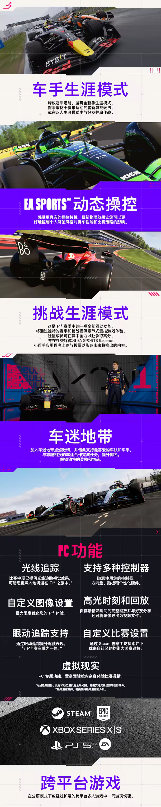在 2024 赛季世界一级方程式锦标赛™官方电子游戏《EA SPORTS™ F1® 24》中成为二十精英之一。F1® 生涯模式自 2016 年以来首次迎来重大更新,即刻投身其中,释放冠军潜能,力争流芳百世。借助全新 EA SPORTS 动态操控系统,效仿传奇尽情驰骋,体会与赛车融为一体的感觉。与最喜爱的车队和车手建立联系,点燃激情,并在全新的模式和体验中证明自己的实力。