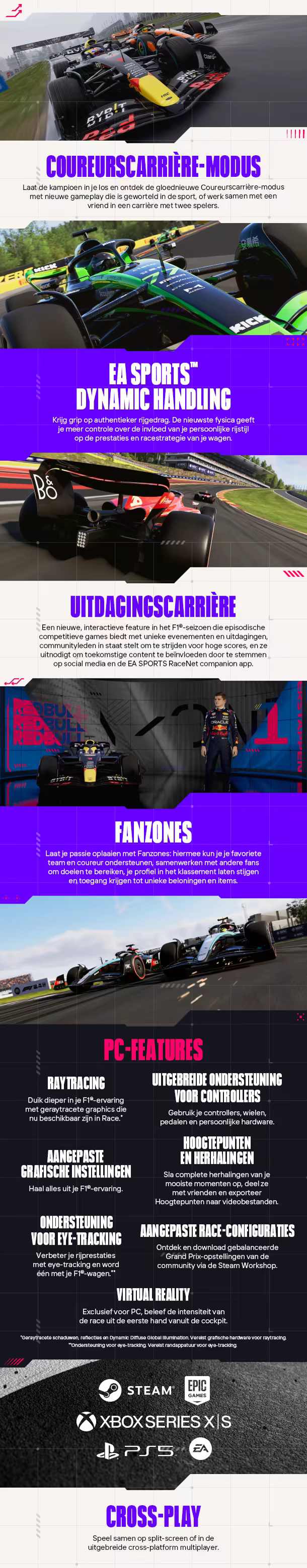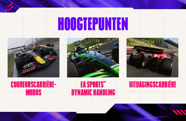 Word een van de 20 met EA SPORTS™ F1® 24, de officiële videogame van het 2024 FIA Formula One World Championship™. Laat de kampioen in je los terwijl je een legendarische F1®-carrière nastreeft in de eerste grote update van de modus sinds 2016. Rijd als de allergrootsten en voel je één met de wagen dankzij het gloednieuwe EA SPORTS Dynamic Handling System. Laat je passie oplaaien door op de hoogte te blijven van je favoriete teams en coureurs terwijl je bewijst dat jij het in je hebt in nieuwe modes en spelervaringen.