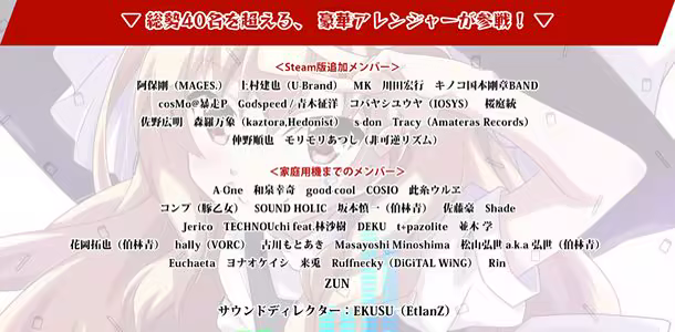 東方アレンジで著名な音楽サークル「豚乙女」「SOUND HOLIC」「A-One」「森羅万象」などに加え、音楽ゲームやボカロPの世界でも著名な活動をしている、「cosMo@暴走P」「モリモリあつし」「t+pazolite」「Godspeed/青木征洋」、そして本作のために「東方アレンジ」に挑戦していただいた、「桜庭統」「並木学」「阿保剛(MAGES.)」「川田宏行」を初め、アーケードゲームや家庭用ゲームの第一線で活躍している、レジェンドクリエイター陣も20人以上参戦!