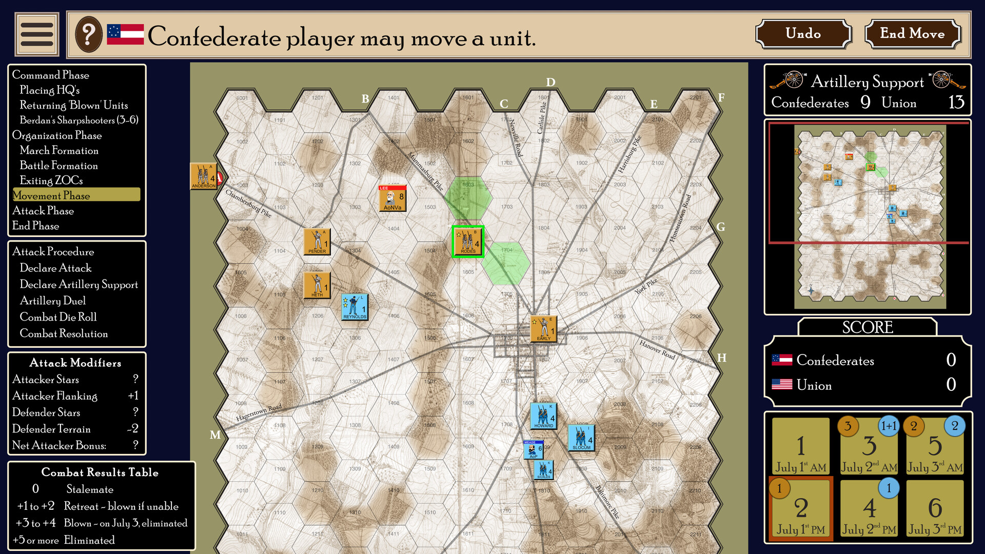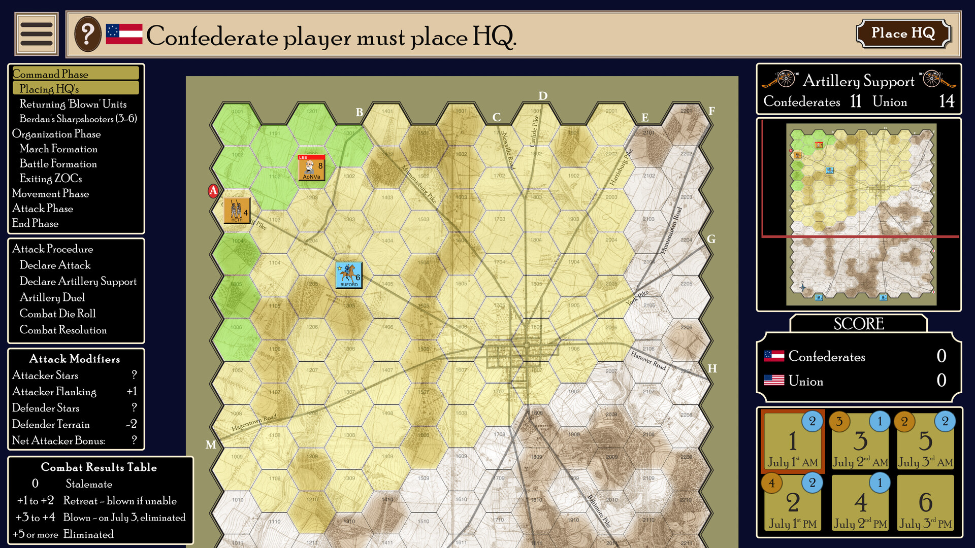The Confederates begin the game with less artillery support but ultimately receive more units and benefit from a greater area of influence generated by General Lee. Only the Union player can deploy a special sharpshooter unit that protects a single hex from the Confederate advance. Careful placement of this unit can help block a Confederate advance farther into the North.
