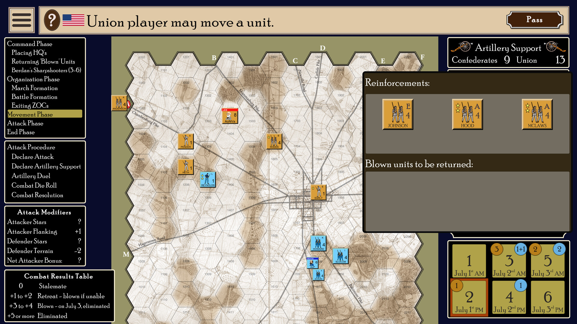 RBM Studio's Gettysburg features gameplay based on the historical wargaming boardgames of the 70's and 80's. Players maneuver markers that represent their units on a hexagonal map that mimics the gameboard and cardboard counters of traditional boardgames. Turns are completed in an "I go, you go" style, wherein players alternate their turns with their opponent until one player passes. Once that happens, a random number of unopposed actions are given to their opponent. Pass too early and you risk giving your opponent the opportunity to maneuver completely around your forces. Combat is resolved through die rolls modified by terrain, battle line factors, and the use of artillery support. Attackers benefit from flanking defenders. Defenders benefit from being in defensible terrain.