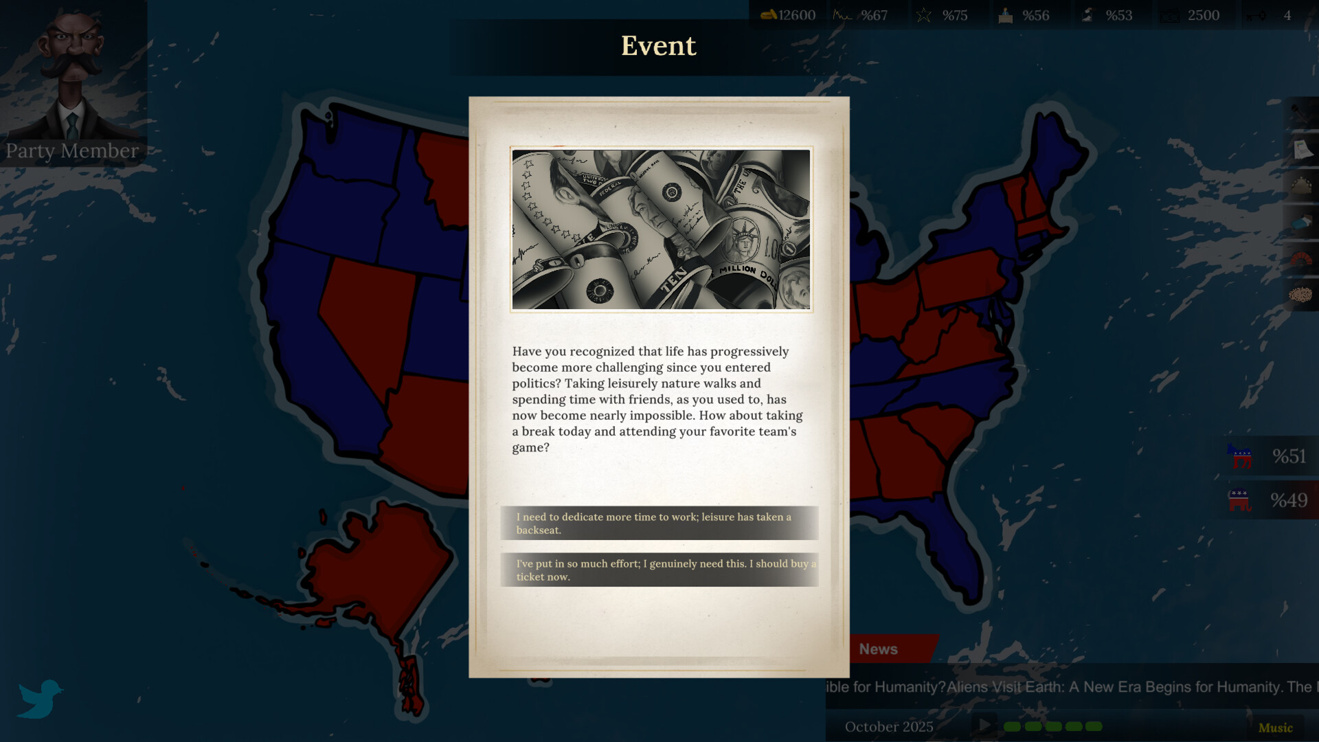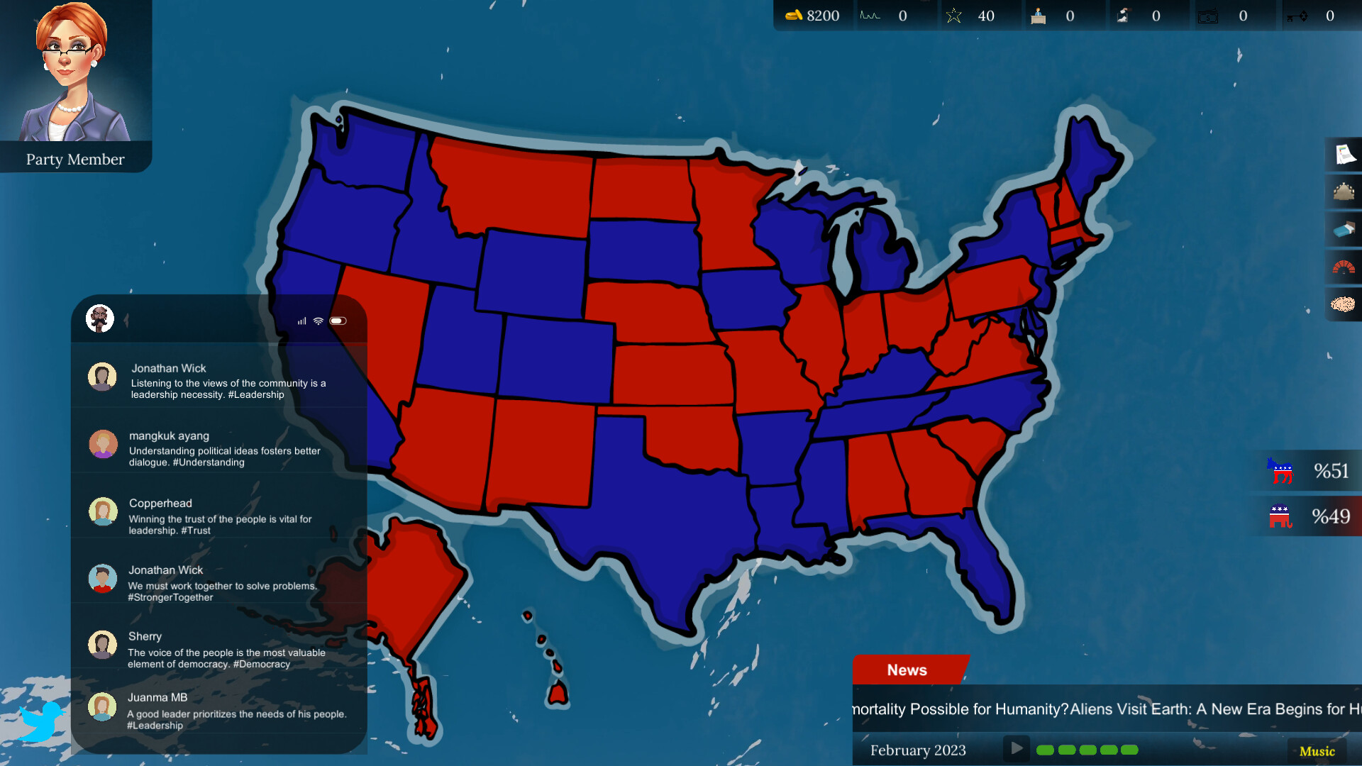 Gérez vos relations avec les puissants lobbies du pays. Analysez les attentes des électeurs dans les différents États et maintenez un équilibre délicat. Défendez votre réputation face à la pression médiatique. Utilisez intelligemment votre budget de campagne, définissez vos promesses, nouez des alliances et réagissez instantanément aux crises imprévues.