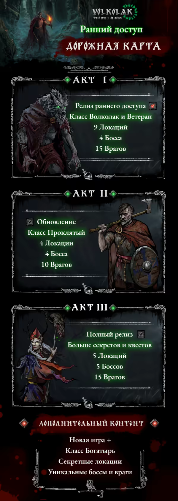 «Мы планируем, что «Волколак: Воля Богов 1.0 будет состоять из 3 актов. А также мы планируем учитывать отзывы игроков на протяжении всего периода разработки и версия 1.0 может отличаться от того, что мы уже запланировали. До выхода версии 1.0 мы планируем добавить в игру следующие обновления: