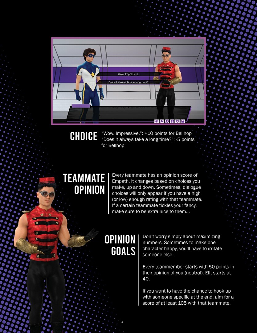 These 70+ pages guide you through most conversations, with the best responses, to help build trust with your teammates. Highlights places where your decisions will impact future endings or achievements.