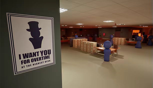 First person, single player game about employee who think's that leaving overtime (not paid) in this company is simple.