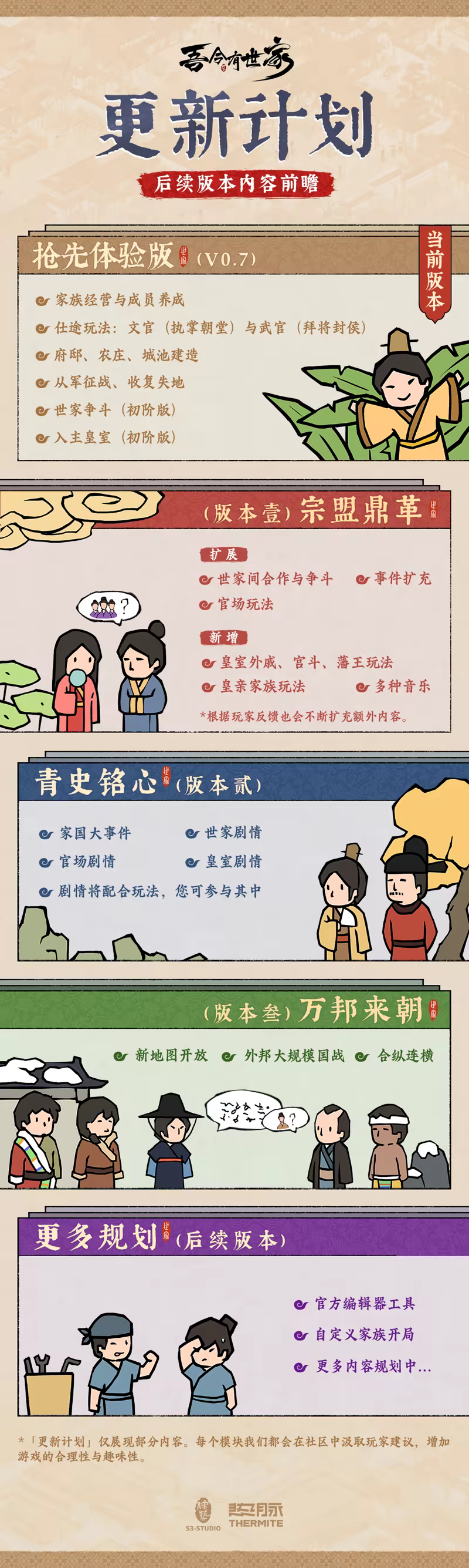 “游戏历经了3年的开发,已经拥有了相对丰富的内容,我们希望为游戏填充更多的玩法、剧情等内容,但也想让大家尽快体验到《吾今有世家》主体内容,并且希望能与大家积极互动,收集建议,让游戏能够朝着大家喜欢的方向发展,所以想用抢先体验的方式跟大家尽早见面。”