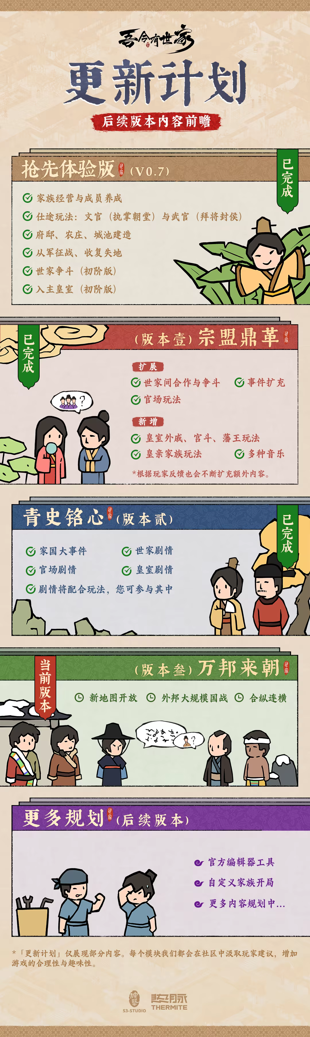 “游戏历经了3年的开发,已经拥有了相对丰富的内容,我们希望为游戏填充更多的玩法、剧情等内容,但也想让大家尽快体验到《吾今有世家》主体内容,并且希望能与大家积极互动,收集建议,让游戏能够朝着大家喜欢的方向发展,所以想用抢先体验的方式跟大家尽早见面。”