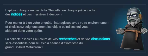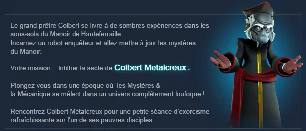 Felon-E est un jeu d’enquête où le joueur doit infiltrer une secte secrète de robot, interagir vocalement avec les PNJ pour collecter des indices et pour gagner la confiance du prêtre robotique Colbert Metalcreux !